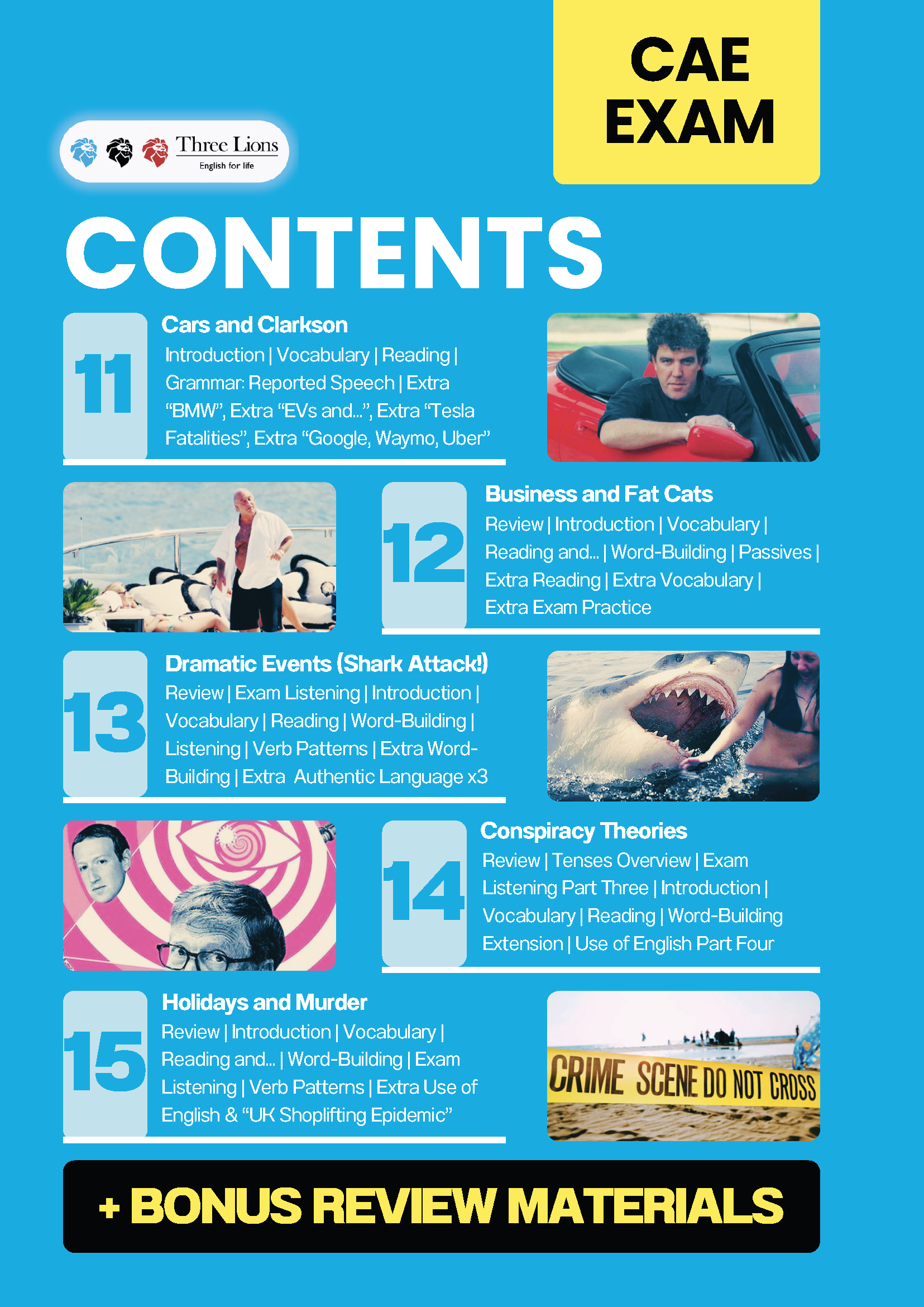 Każda z pięciu lekcji zawartych w naszych materiałach jest doskonale wyważona – zawiera nowe słownictwo, ćwiczenia gramatyczne oraz wprowadzenie do każdej sekcji egzaminu CAE.