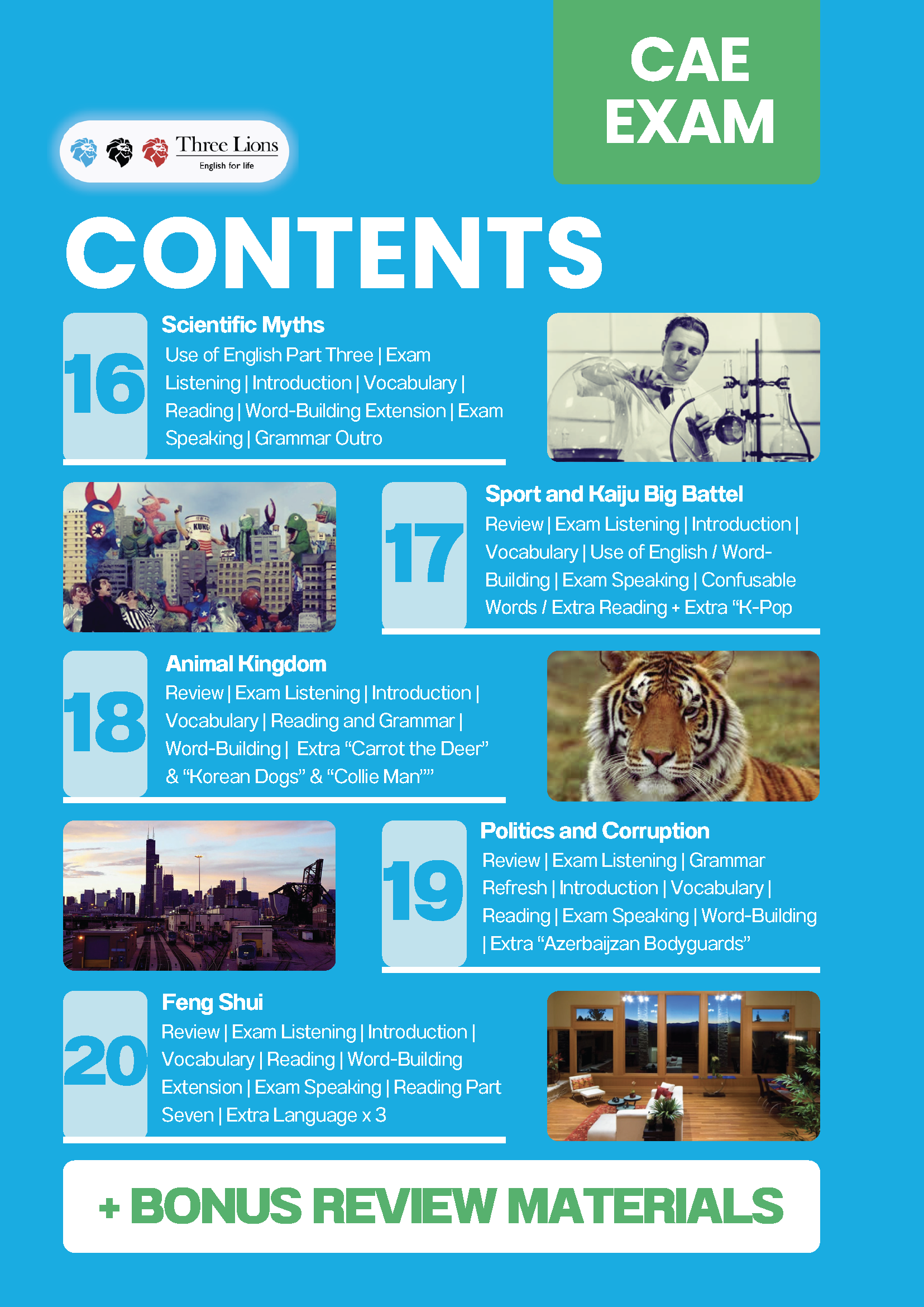 Każda z pięciu lekcji zawartych w naszych materiałach jest doskonale wyważona – zawiera nowe słownictwo, ćwiczenia gramatyczne oraz wprowadzenie do każdej sekcji egzaminu CAE.