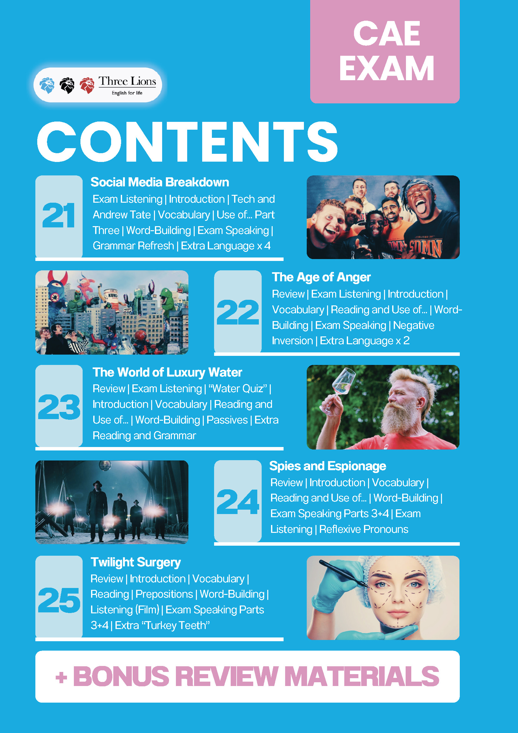 Każda z pięciu lekcji zawartych w naszych materiałach jest doskonale wyważona – zawiera nowe słownictwo, ćwiczenia gramatyczne oraz wprowadzenie do każdej sekcji egzaminu CAE.